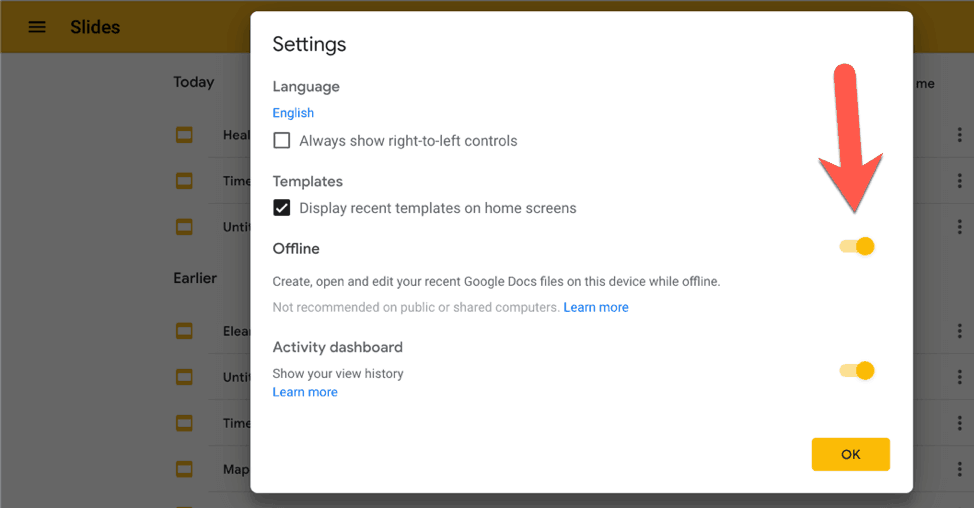 Untuk mengaktifkan akses offline harus menggunakan browser Chrome (Mac atau PC). Kamu tidak dapat melihat opsi untuk membuat file tersedia secara offline di browser non-Chrome. Untuk pengguna seluler, harus menggunakan aplikasi Google Slides resmi. Anda harus terhubung ke Internet dan masuk ke Chrome. Jangan gunakan mode pribadi atau penyamaran. Kamu juga perlu mengunduh dan mengaktifkan ekstensi Dokumen Google Offline Chrome agar akses offline dapat dilakukan. Selanjutnya, kamu harus pergi ke layar utama Slides dan membuka opsi Menu. Klik Pengaturan dan aktifkan akses Offline.