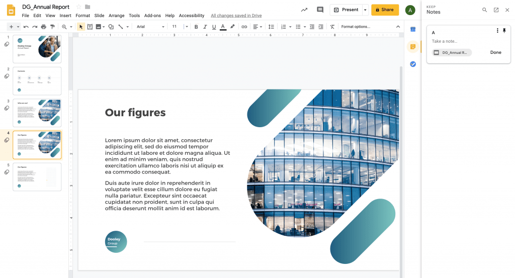 Jika Anda menggunakan aplikasi Google G Suite lainnya, side panel (panel samping) internal dapat membantu meningkatkan produktivitas Anda. Panel samping menyediakan akses mudah ke aplikasi Google lainnya, seperti Calender, Keep, dan Tasks. Dengan Google Keep, Anda bahkan dapat menarik catatan yang tersimpan langsung ke slide Anda melalui panel samping.