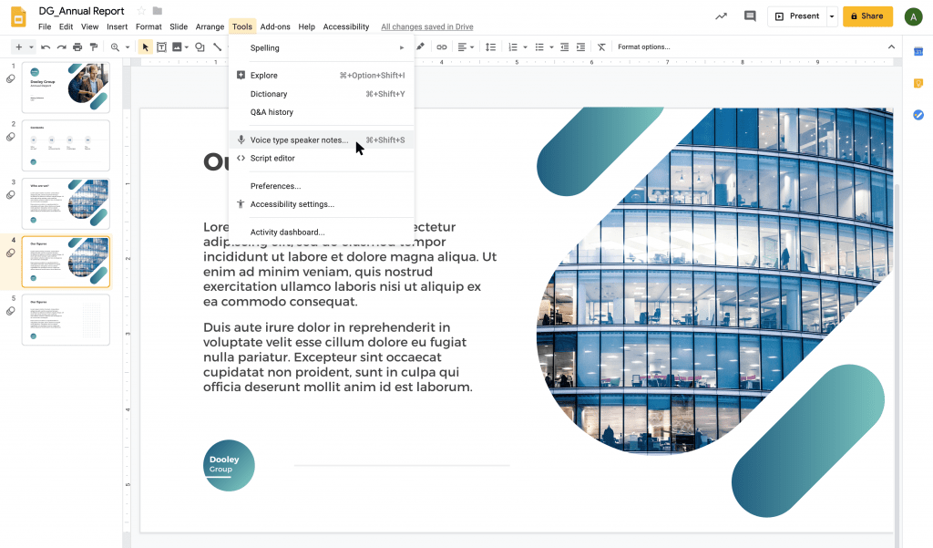 PowerPoint memang memiliki fitur bawaan untuk voice type, namun saat ini hanya pelanggan Office 365 yang dapat mengakses fitur ini. Jika Anda ingin mengakses fungsi ini tanpa membayar untuk fitur tersebut, Google Slides menawarkan opsi gratis. Plus, ini sangat mudah digunakan. Untuk menggunakannya dengan mengakses speaker notes bar dengan menarik ke atas dari bawah, lalu pergi ke Tools di menu dan pilih voice type speaker notes, Ini akan meluncurkan jendela baru di sebelah kiri slide Anda. Saat Anda siap, klik ikon mikrofon dan mulai berbicara. Anda akan melihat kata-kata Anda muncul sebagai teks di speaker notes bar. Fitur ini berfungsi paling baik ketika berbicara dengan jelas ke mikrofon atau headset yang baik
