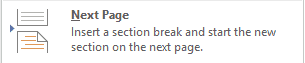 Next Page section breaks, akan memulai section (bagian) baru pada halaman berikut. Pemutusan satu halaman untuk memulai halaman selanjutnya sebagai section baru. Pada halaman section baru tersebut dapat membuat nomor halaman, orientasi, ukuran kertas, dll. berbeda dengan halaman sebelumnya sampai dengan Anda membuat section baru lagi. Pilih Layout> Breaks> Next Page.